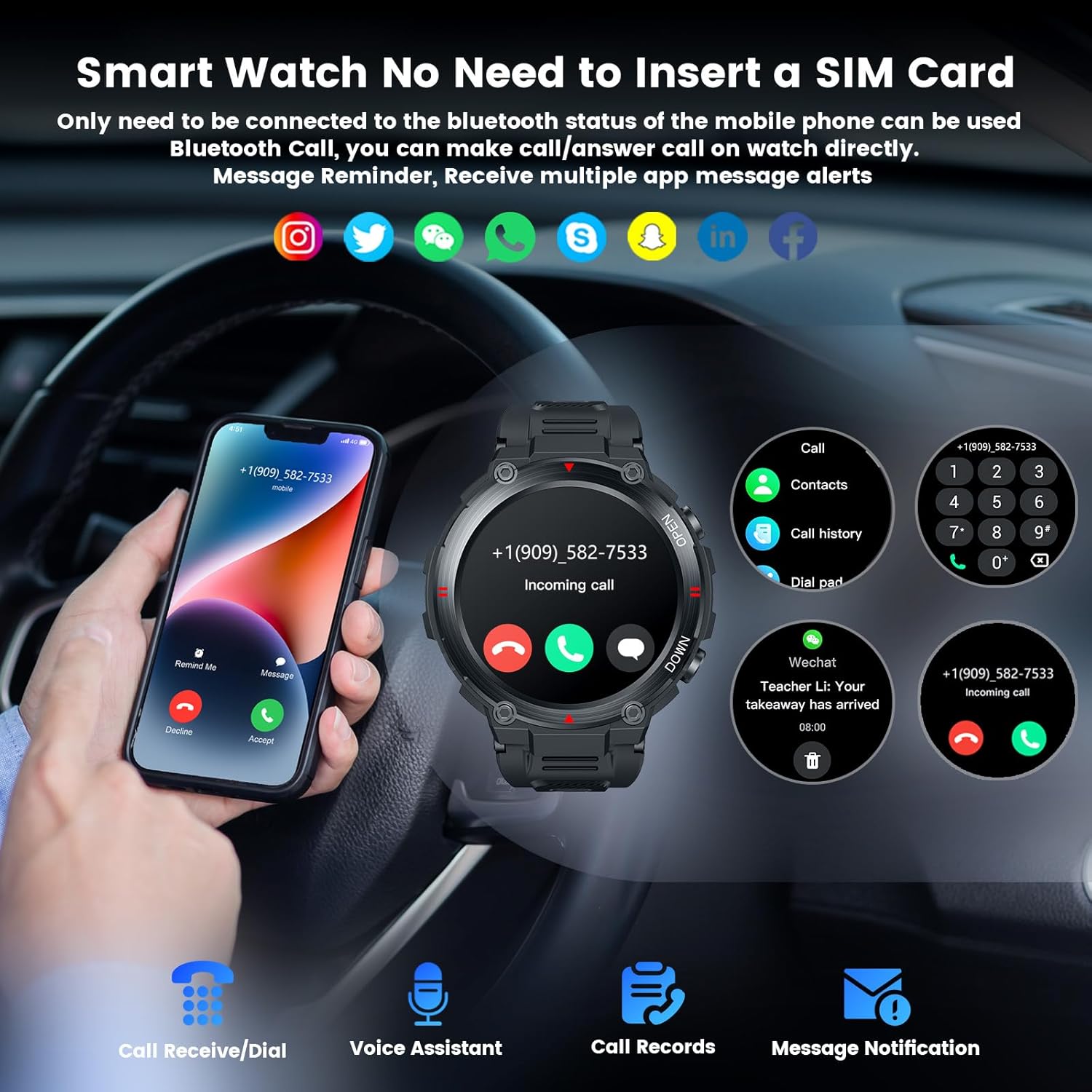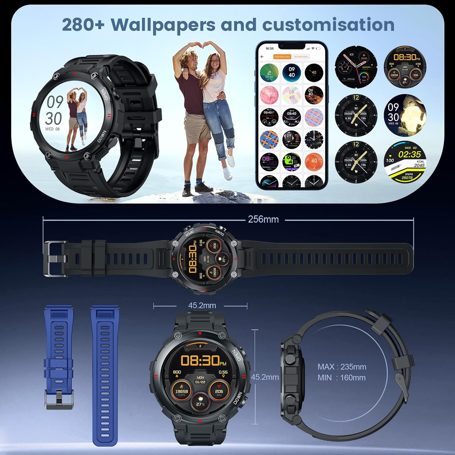 Military smart watches for men adopted fully enclosed ultra-thin micro sandblasted metal frame and titanium case,smartwatches passed 15 military quality standard tests such as severe temperature,24-hour resistance to humidity and heat,dustproof,shockproof,shock resistance,low-pressure high altitude,resistance to frost and freezing rain etc.,this waterproof smart watch for men is a good choice for you to exercise outdoors