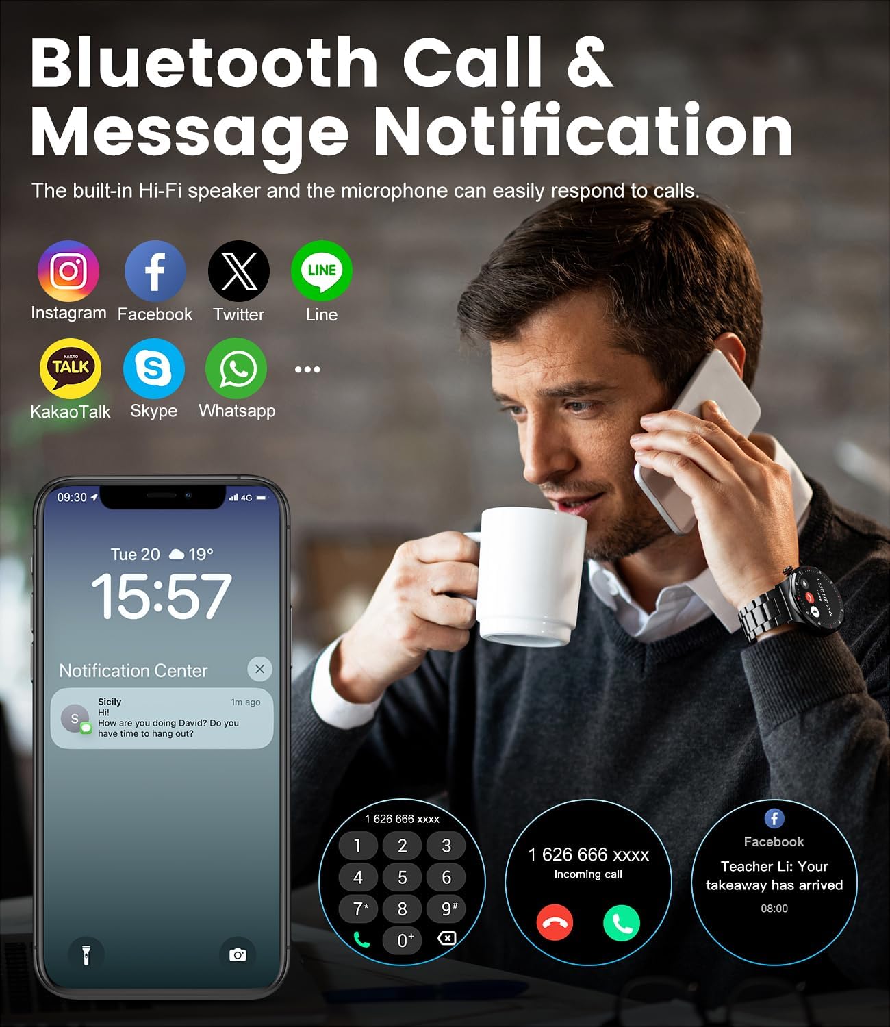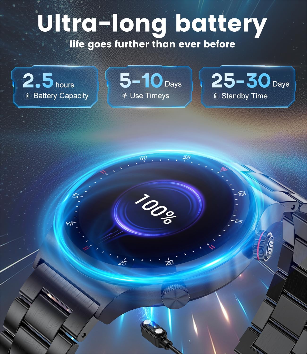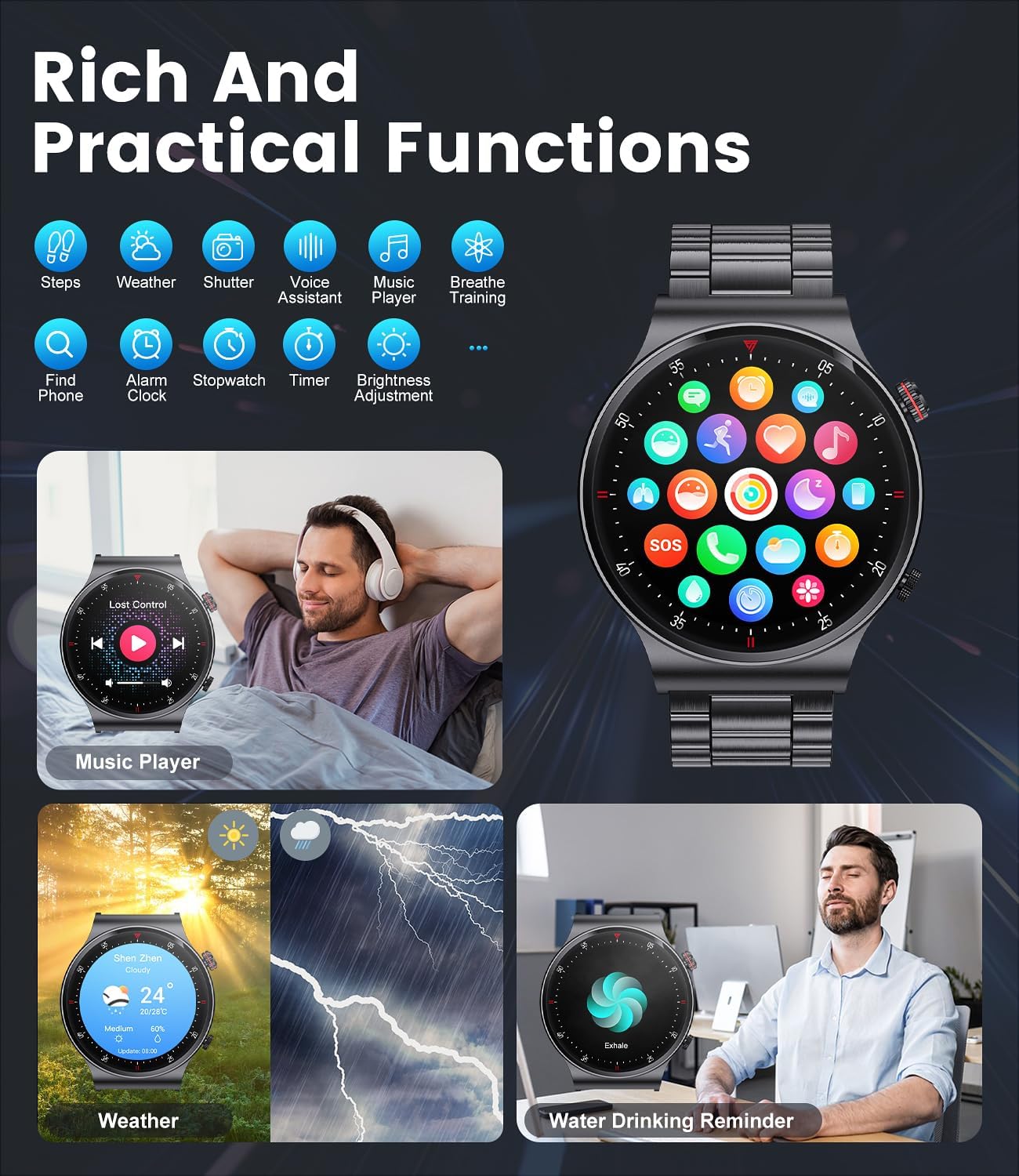 Smartwatch for Men with AMOLED Display:The 1.43-inch HD AMOLED display of the men’s smartwatch offers a faster response time, higher contrast, larger viewing angle, and lower power consumption. The colors on the screen are richer and more detailed, and the touch is smoother. Even in direct sunlight, you can read the time and notifications without moving your wrist to wake up the screen!