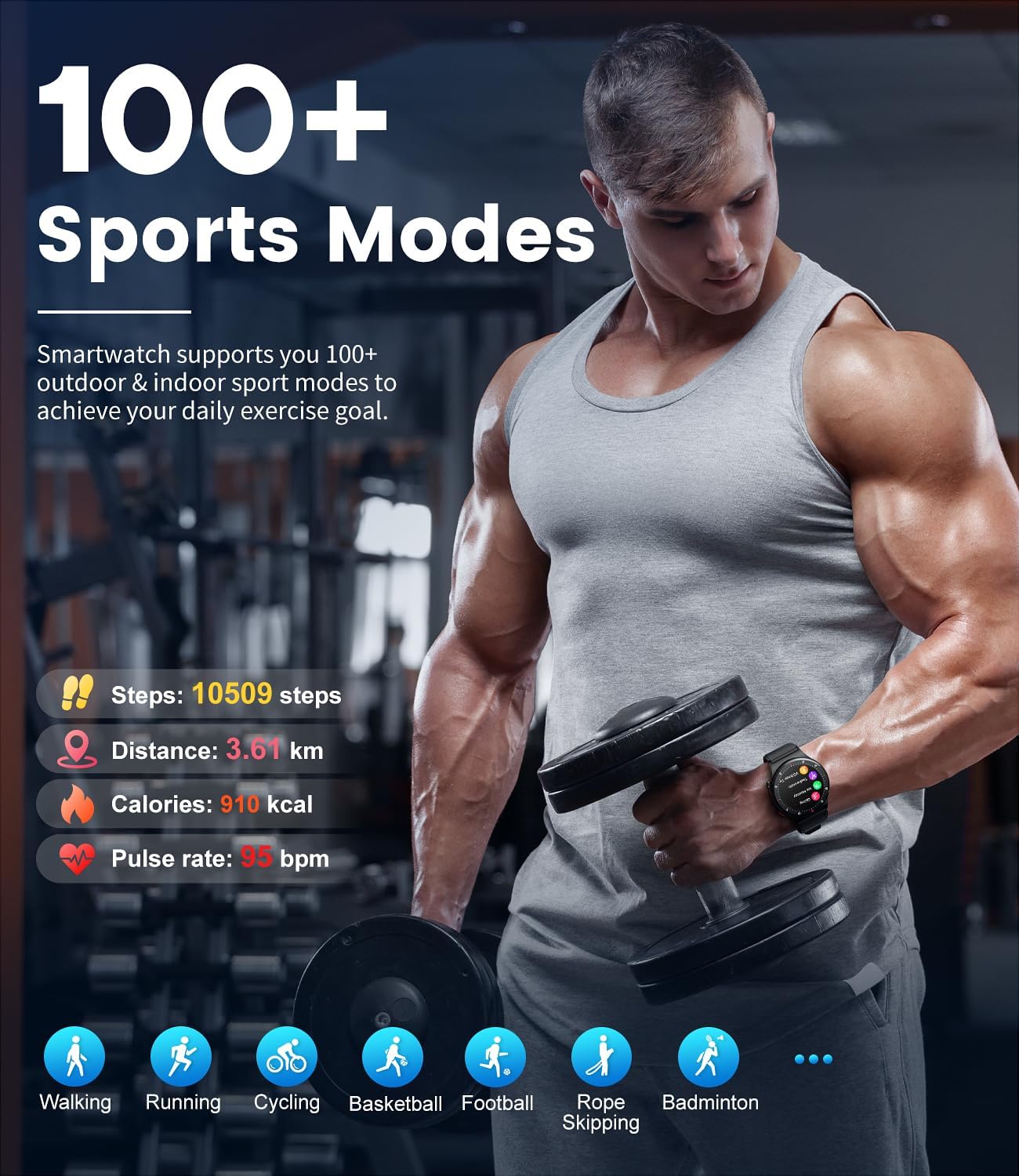 Sports Smartwatch for Men with 100+ Sports Modes:Smartwatch for male with more than 100 sports modes, It can track your daily activity data such as steps, exercise time, mileage, and calorie consumption, real-time heart rate training.