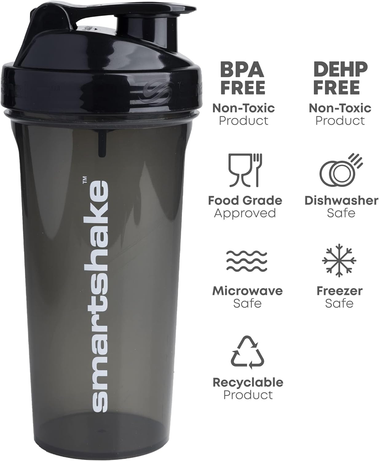 SUPER LIGHTWEIGHT to hold, this protein shaker bottle weighs only 150 grams. The Smartshake Lite comes with our signature shaker net and screw-on leak-proof lid, packed into a no-frills shaker bottle