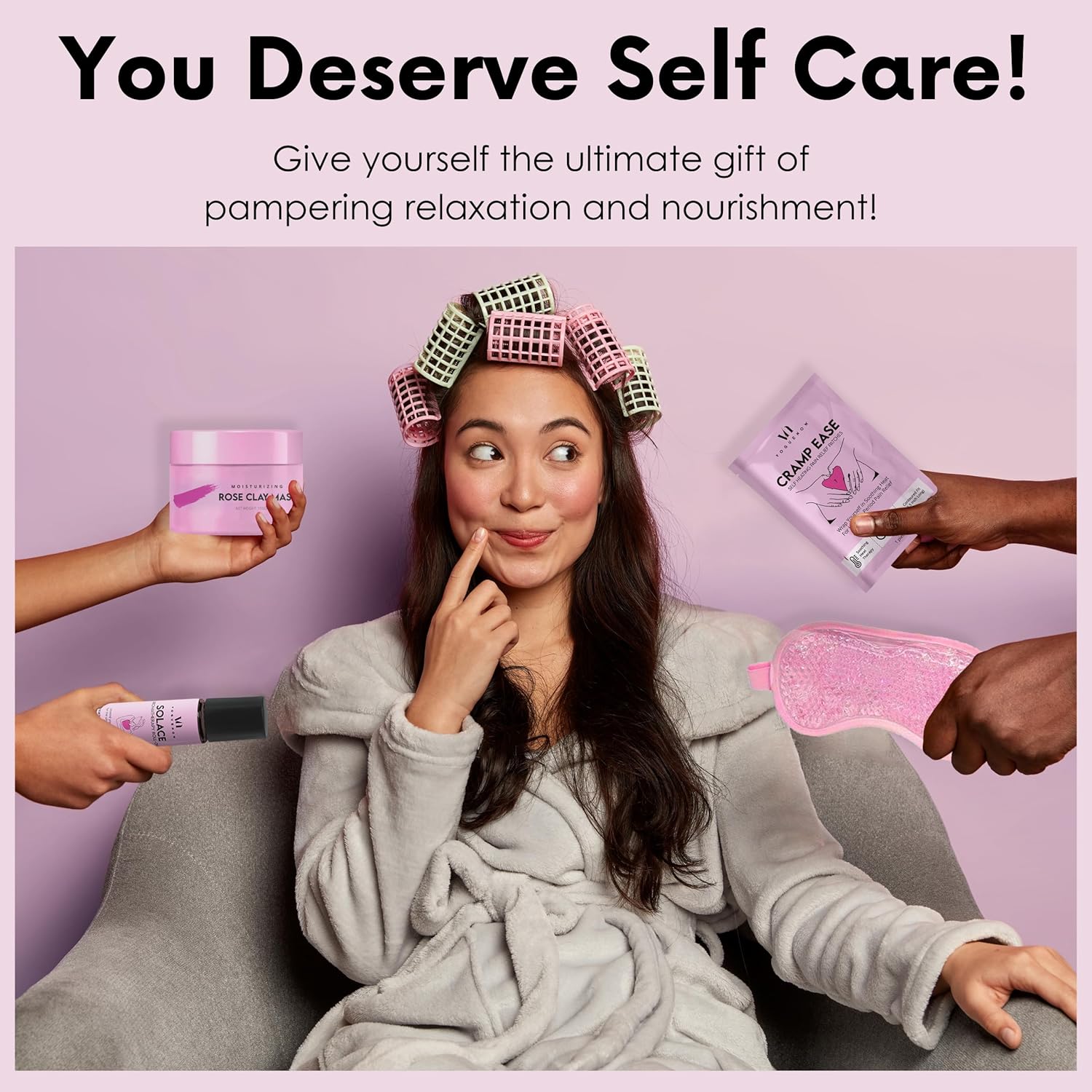 😌 SLEEP TIME & SELF CARE BLISS: Ensure a calming & restful night’s sleep with a calming aromatherapy roll-on and sleeping eye mask! Enter the self care haven with self care items for women with fuzzy socks for comfort and warmth. Soothing period patches to relieve period cramps.