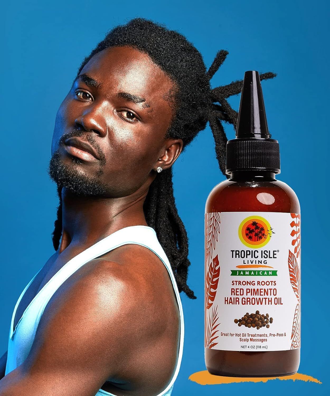 Tropic Isle Living Jamacian Strong Roots Red Pimento Hair Growh Oil, made with our 100% Jamaican Black Castor Oil and infused with Red pimento, Coconut, and Wheat Germ Oils detoxifies and cleanses the scalp, reduces breakage and split ends, stimulates hair growth and adds shine to dry, brittle hair.
