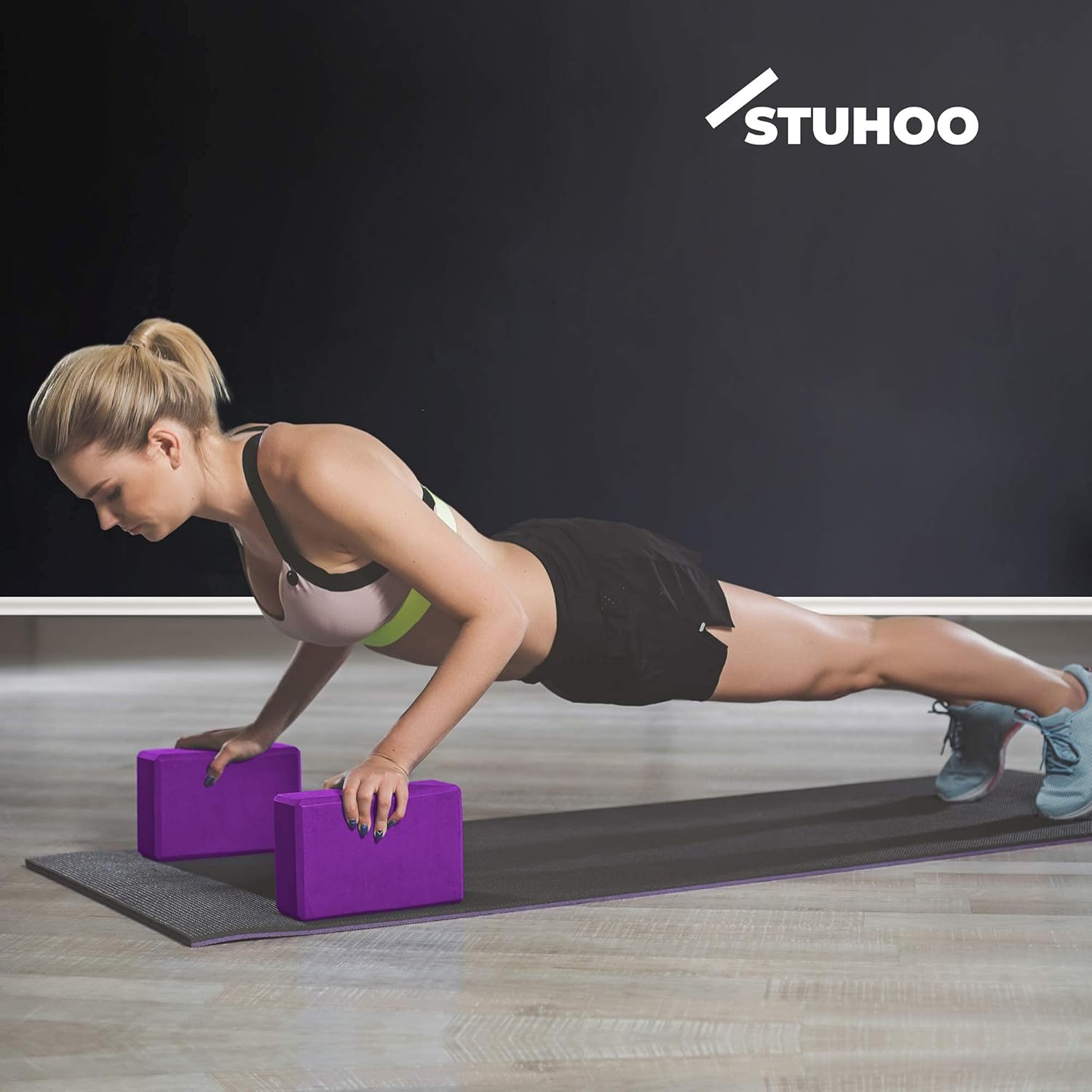 STUHOO Yoga Block Set of 2 and Yoga Strap Includes Descriptive E-book for Beginners Sturdy Yoga Brick & Lightweight Eva Foam Block Support Deepen Poses, Provides Strength & Stability for Pilates Practice