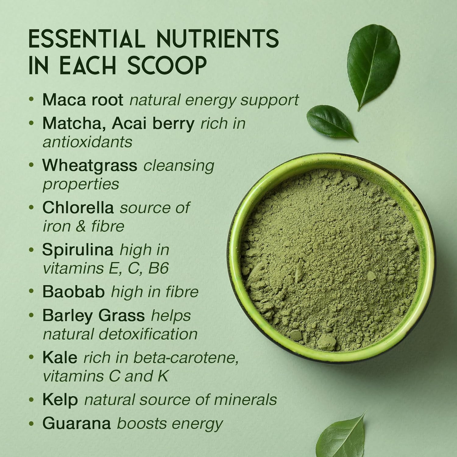 EXCLUSIVE SUPERFOOD BLEND – Every organic ingredient in this powder has been carefully selected to work together in natural harmony; no fillers, colourings, or additives allowed. High in protein, fibre, vitamins and minerals – this super greens powder contains only wheatgrass, chlorella, spirulina, acai berry, matcha green tea, maca root, flaxseeds, baobab, barley grass, kale, kelp, and guarana.