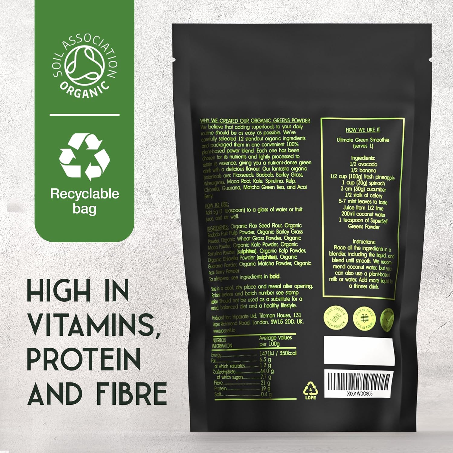 CERTIFIED ORGANIC GREENS POWDER – Proudly certified by the UK Soil Association, this organic greens and superfood powder meets the highest standards of organic integrity and environmental sustainability. This certification ensures that every ingredient in our powder is grown and processed without the use of synthetic chemicals or GMOs, preserving the natural potency of our superfoods.