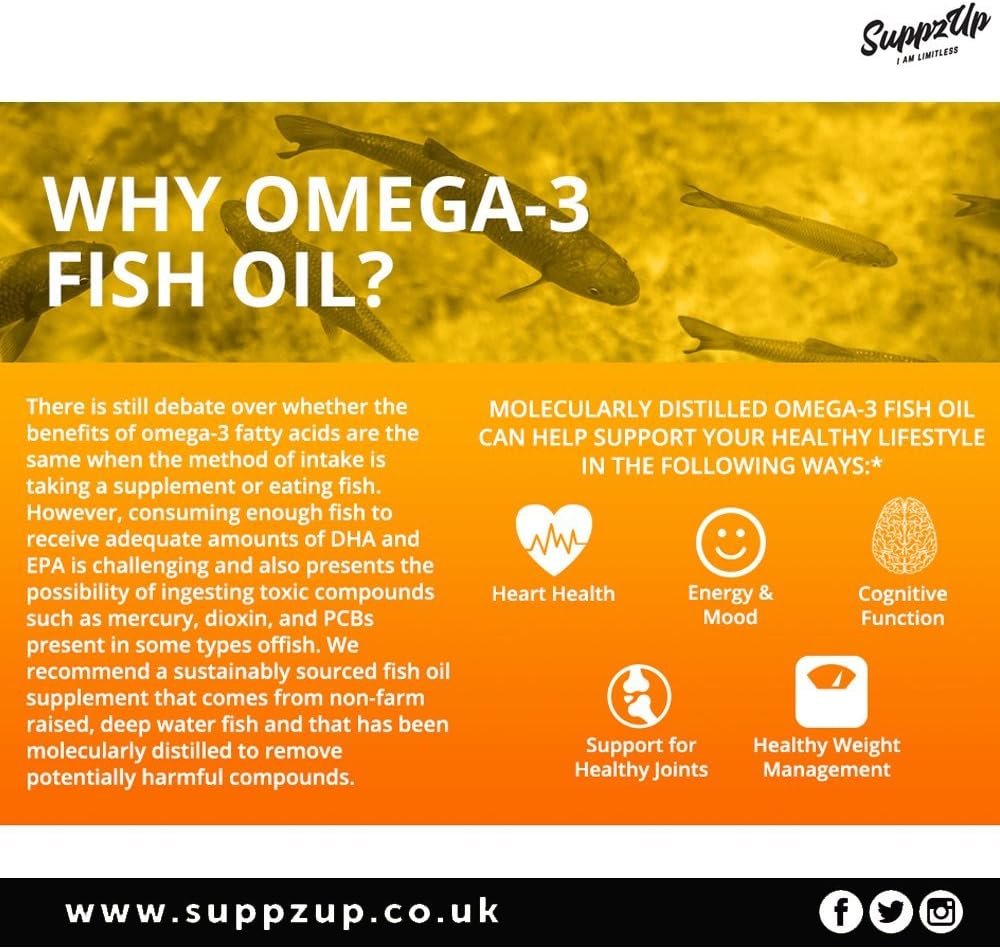 Suppzup Omega 3, 6 and 9 Fish oils contain essential fatty acids and oils that the body needs to maintain overall health and well-being. Omega 3, Omega 6 and Omega 9 capsules provide the correct balance of essential omega oils in one convenient daily health supplement that is easy to swallow. Omega 3, Omega 6 and Omega 9 oils are required for many different bodily functions and are an essential part of your diet as these ‘good’ Fatty acids aren’t produced by the body, they have to be ingested through a healthy diet or supplement form. These omega 3, Omega 6 and Omega 9 supplement blends fish oil, flaxseed oil and borage oil to provide the body with ALA, EPA, DHA, linoleic, oleic acid, and GLA. It is just as important to have the correct ratios of omega 3, 6 and 9 in the diet as it is to include them.