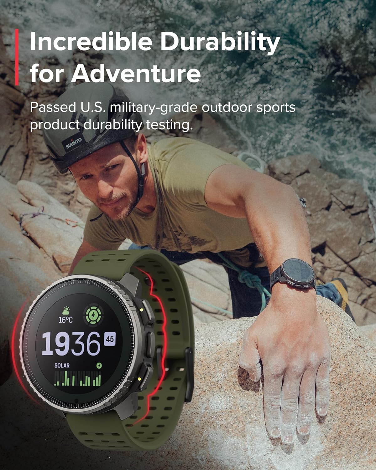 BREAKTHROUGH IN ENDURANCE – SUUNTO Vertical watch has ultra-long battery life of 60 days in daily use and 60 hours in Performance mode (dual-band GNSS track). Furthermore, the solar version adds another 30% of battery life in over 50,000 lux of sunlight.