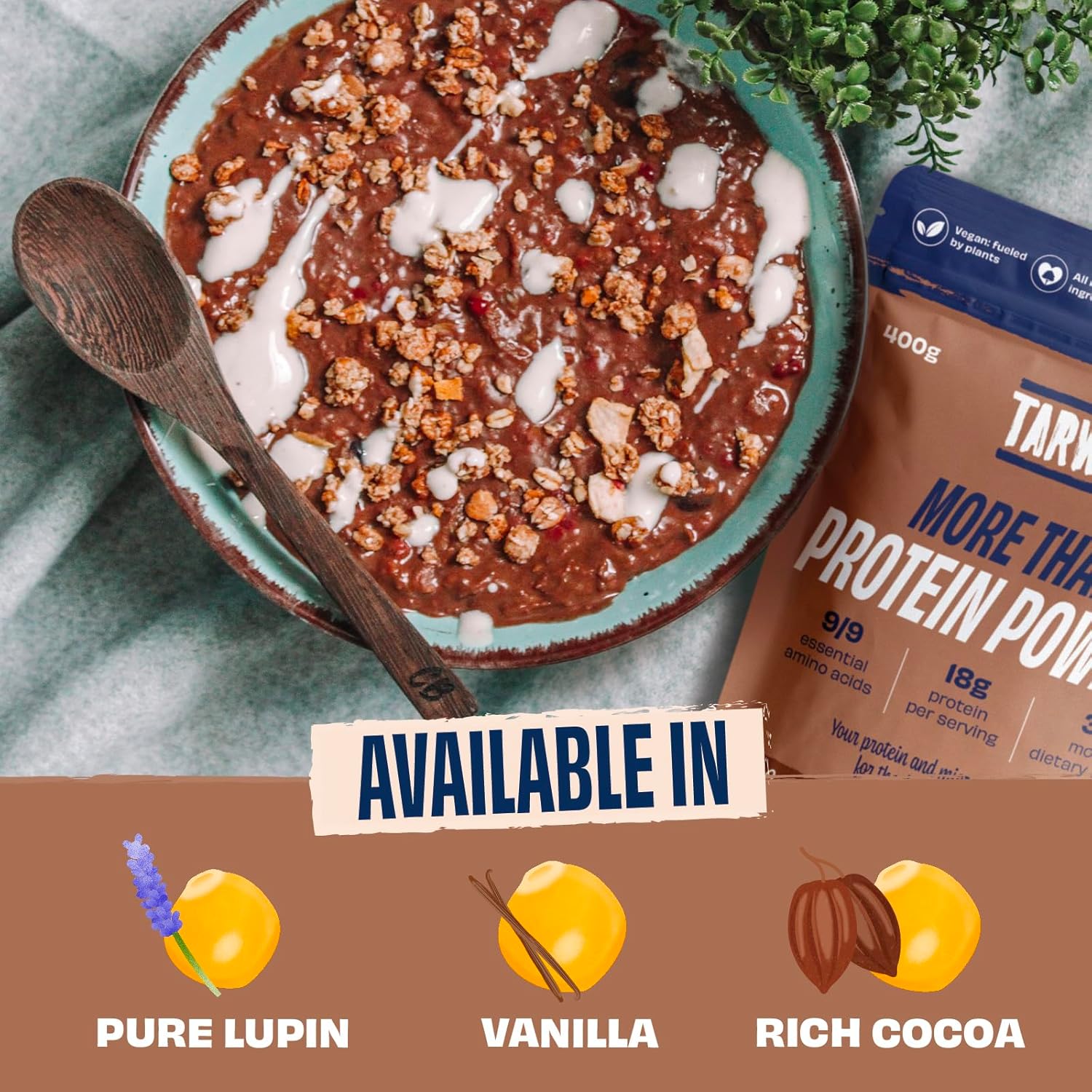 Tarwi Lupin 100% Natural No Bloating Vegan Protein Powder + High Fibre Gut Friendly Plant Based Protein 400g Rich Cocoa 5 Ingredients Clean Protein 9 Essential Amino Acids + Prebiotics Lupini
