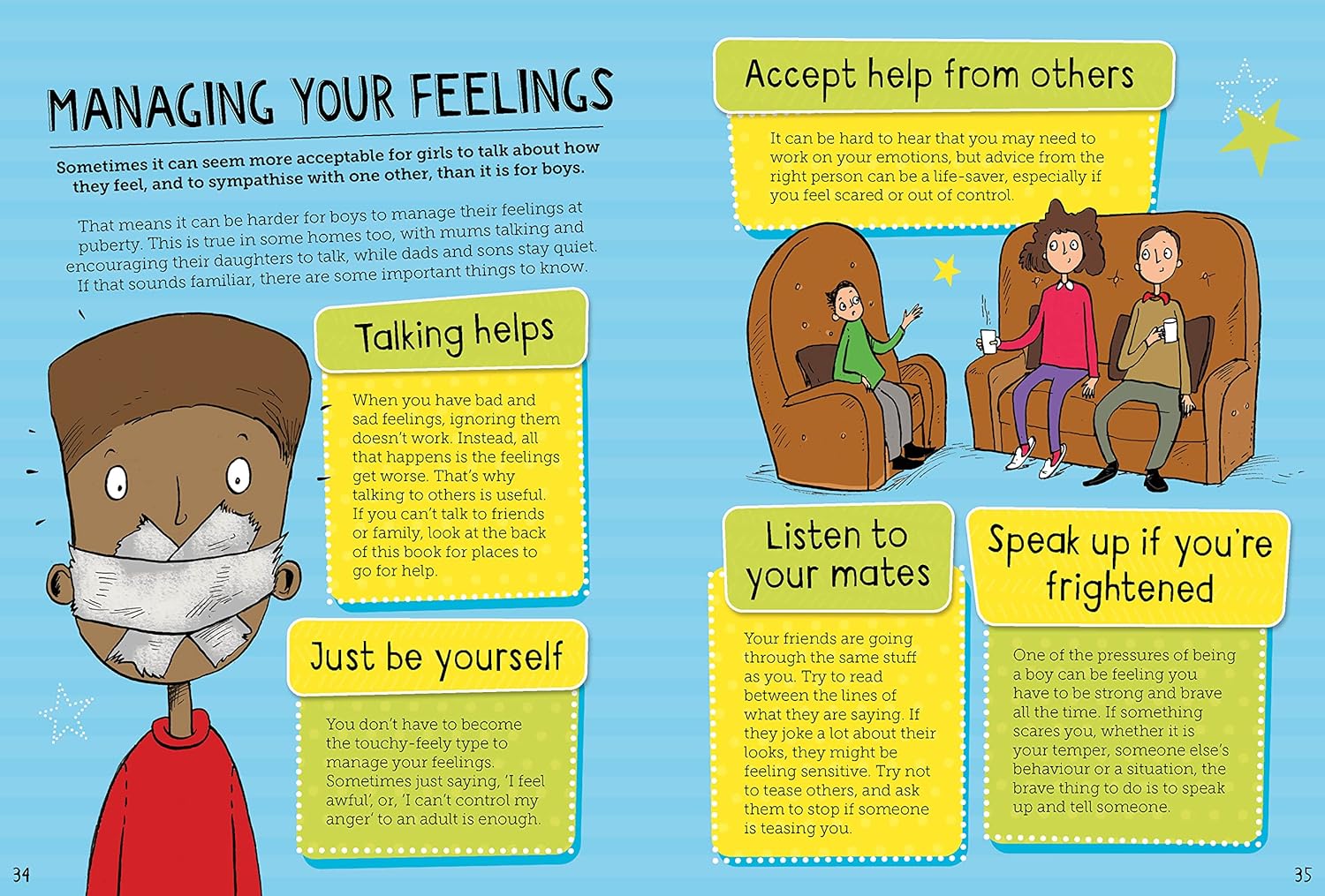 The Boys’ Guide to Growing Up also includes advice on topics such exercise, healthy eating, shaving, talking about feelings and how puberty affects girls, and has an age-appropriate section on sex and reproduction.