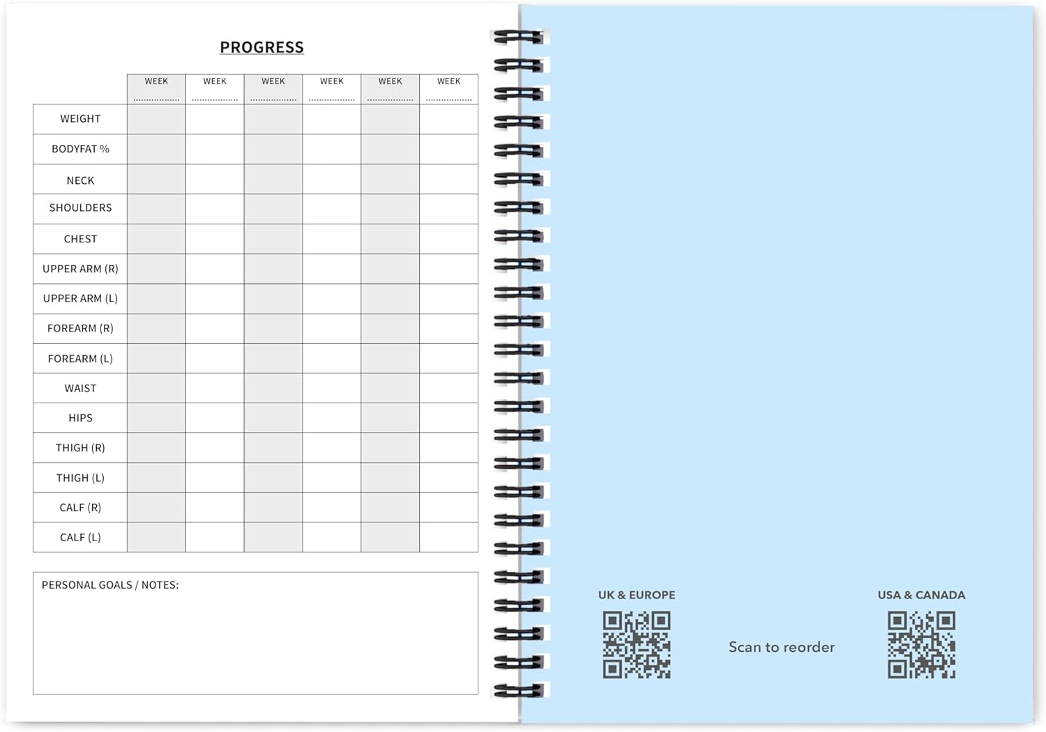 104 page A5 Workout Log for you to complete full details of every workout and your training development and progress. Enough space for 100 workouts. Double strength black wires with a 450gsm card front and back for added strength and durability.