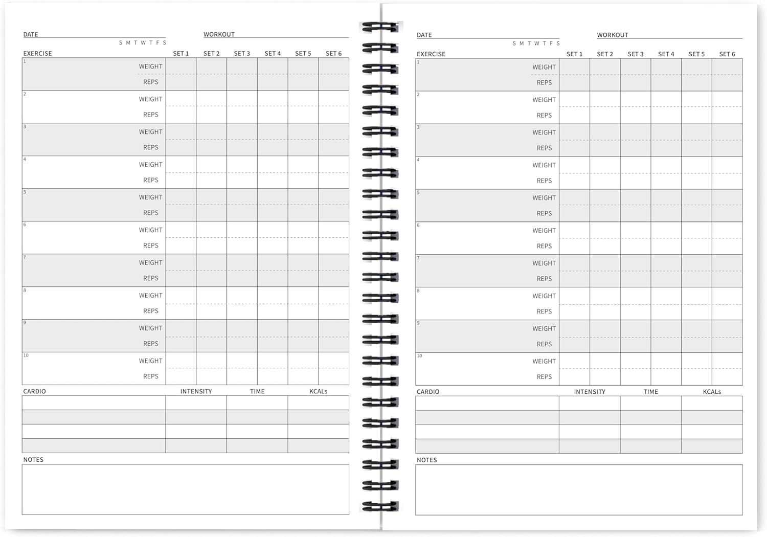 RECORD EVERY WORKOUT – Record up to 100 workouts with ten exercises per training session. Make notes of every workout including any cardio undertaken in addition to the number of sets/reps and weight used when strength training