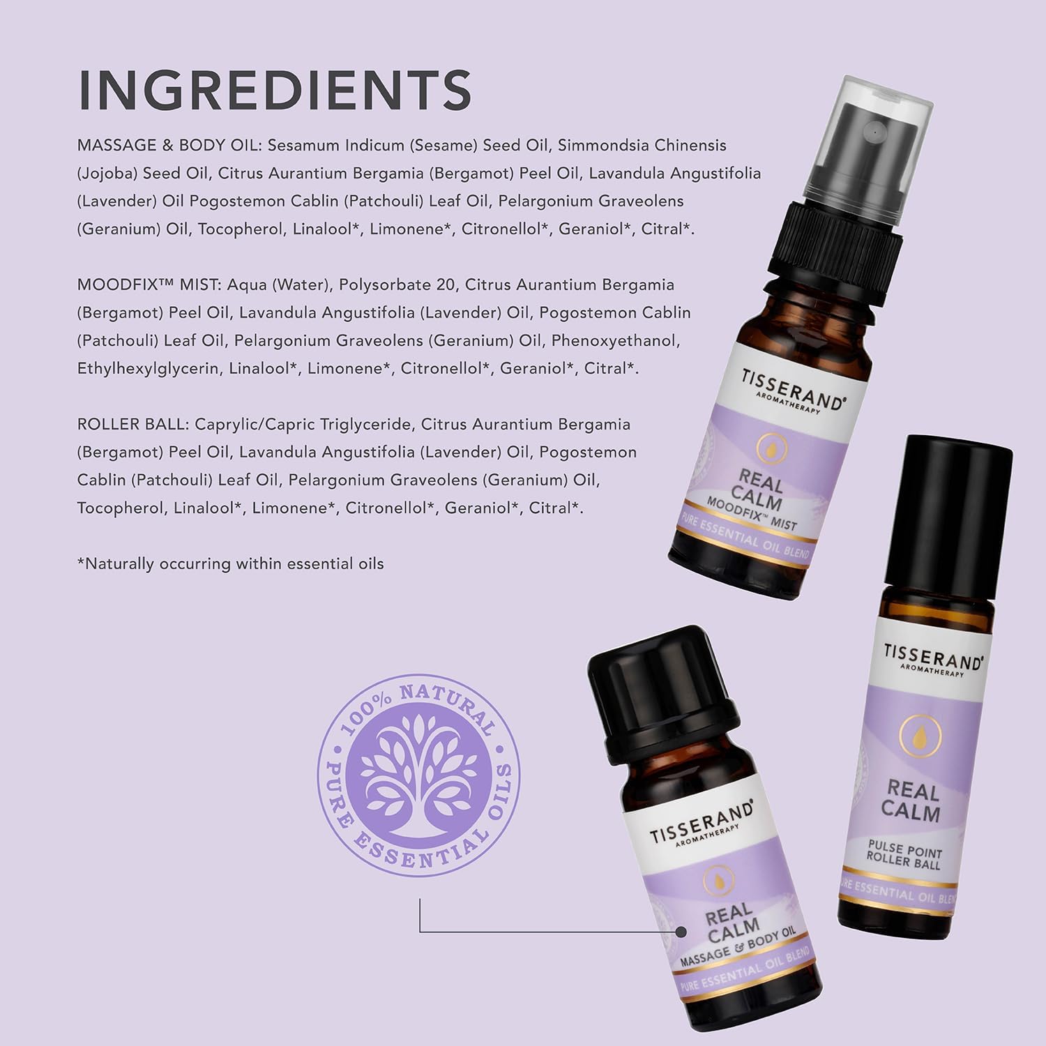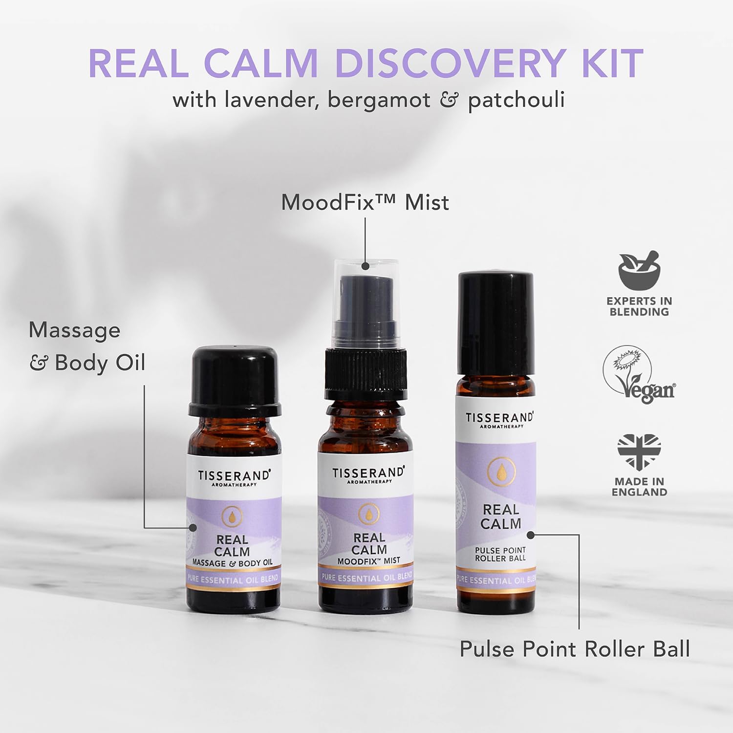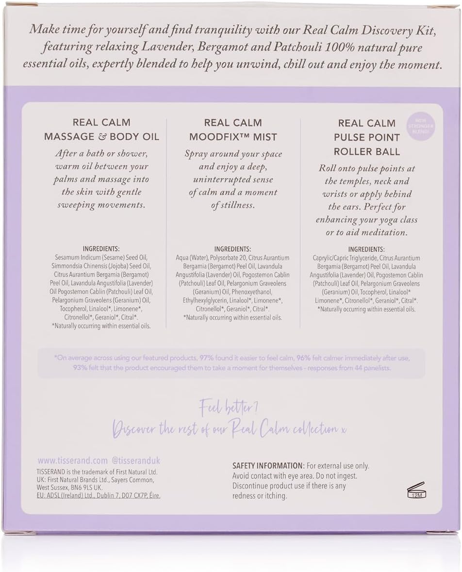 **THE PERFECT RELAXATION KIT**Our Real Calm Discovery kit bring the aromas of lavender, bergamot, and patchouli to help you make time for yourself and find tranquillity. Tisserand massage oil helps with bringing serenity. **REAL CALM MASSAGE OIL & BODY OIL 9ML**Packed full of vitamins, antioxidants, Omega 6 & 9 and fatty acids, our massage oils are the perfect way to take time for yourself and unwind. Our Patchouli, Bergamot and Lavender massage oil is the ideal way to unwind. After a bath or shower, warm our body massage oil between your palms and massage into the skin with gentle sweeping movements. **REAL CALM MOODFIX MIST 9ML**Bring clarity and peace to your space with our extra fine mist – spray around yourself and enjoy a deep, uninterrupted sense of calm and a moment of stillness. **REAL CALM ROLLER BALL 10ML**Enjoy the benefits of a relax oil with our roller ball for an aromatherapy fix on the go – simply roll onto pulse points for instant calm. Our essential oils relax you and help to bring calm to the mind. **NATURAL INGREDIENTS**Tisserand Aromatherapy’s real calm essential oil blend is crafted with 100% pure and natural ingredients. We are vegan-friendly, free from parabens, SLS/SLES/ALS free and cruelty free!