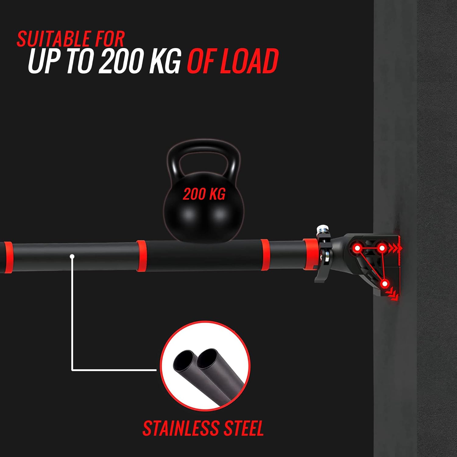 【Capacity & Safety System】- Trio3Tech pull-up bar’s sturdy construction ensures a secure and stable platform for performing upper-lower body exercises. Designed for maximum versatility, this gym bar can be easily adjusted to fit 28-38 inches (72cm-97cm) and withstand up to 200kgs and features a comfortable grip and a 360° locked horn to have an anti-drop protection feature. Making it an ideal addition to exercise at home.