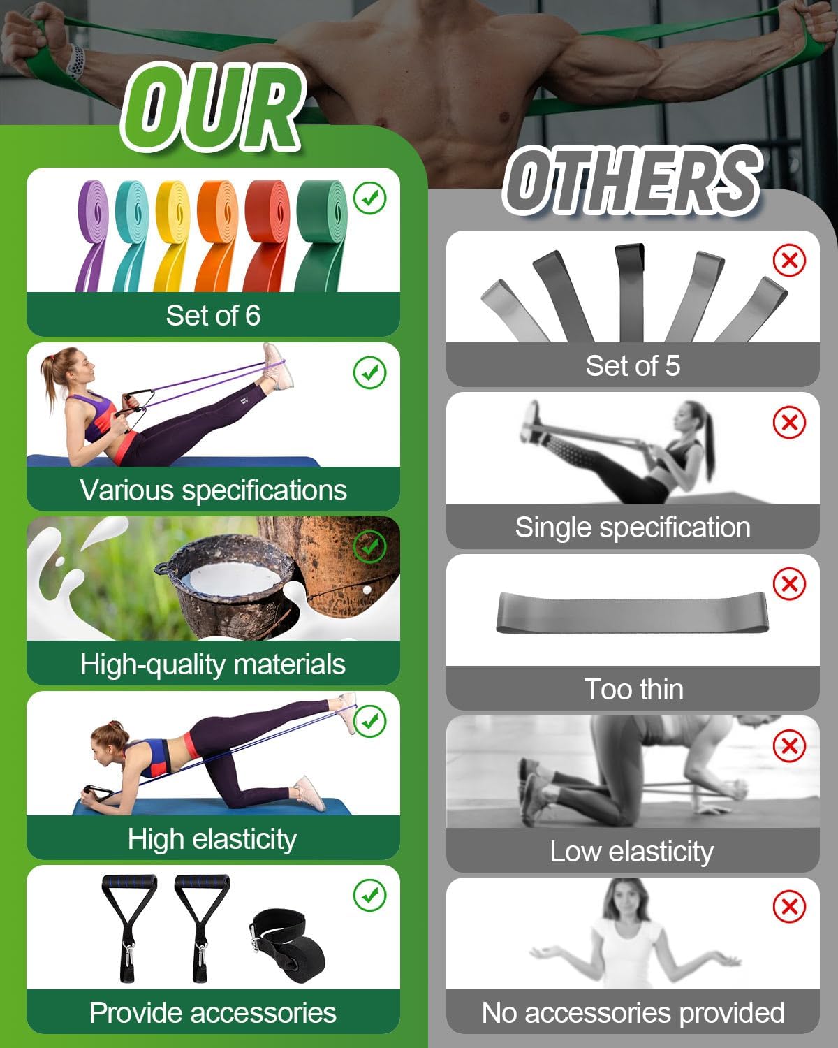 SIX DIFFERENT RESISTANCE LEVELS – The upgraded resistance bands set comes with six different colors and six different resistance levels. Not only did we upgrade in color and poundage, we also increased the number of resistance bands.Resistance levels from 15to170 LBS,The purple bands(15-25 LBS),teal bands(20-35 LBS),yellow bands (30-50 LBS),orange bands(40-80 LBS),red bands(50-125 LBS),green bands(60-170 LBS).Giving you a variety of options that can be used individually or in combination.