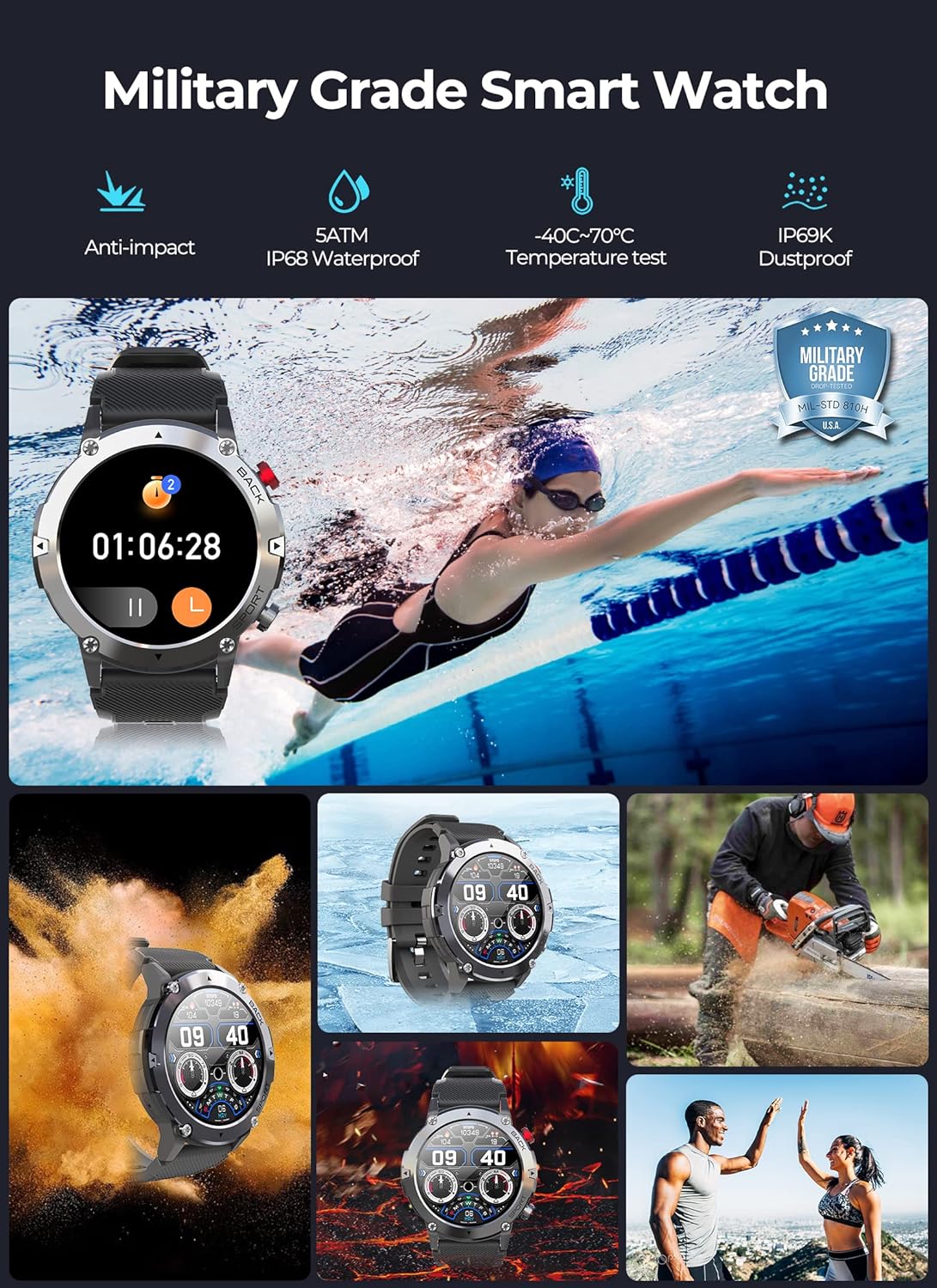 VIRAN Military Smart Watch for Men (Answer/Make Calls), IP68 Waterproof Outdoor Activity Tracker, Multisport Fitness Watch with Step Counter, Heart Rate and Sleep Monitor for Android/iOS Phones