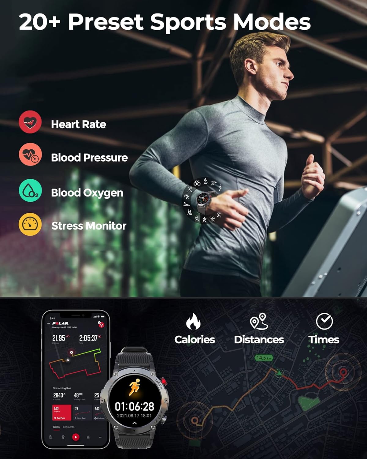 【Super Rugged for Outdoor】VIRAN military smart watch for men is specifically designed for outdoor enthusiasts, with the military standard of IP68 waterproof, shockproof, and anti-magnetic. This smart watch has passed dozens of standard tests like harsh temperature, dust resistance, salt spray, fluid pollution, etc. It’s made of fully enclosed ultra-thin micro-sandblasted metal frame and titanium shell to ensure durability, stability and functionality. Just come with it and enjoy the nature!
