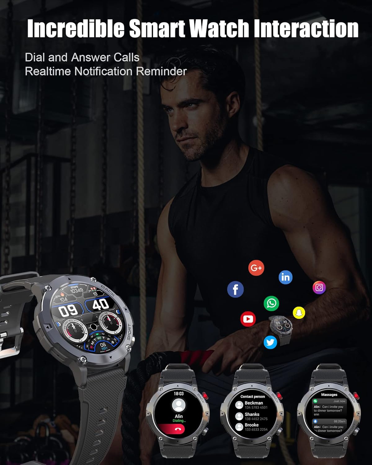 Thanks to the built-in Hi-Fi microphone and speaker, it is very easy to make and answer calls, listen to music and receive messages in real time with the AI voice assistant on the smartwatch while while driving or exercising. You receive messages or notifications from apps (Facebook, WhatsApp, Twitter, SMS, SNS, etc.) on your smartwatch.