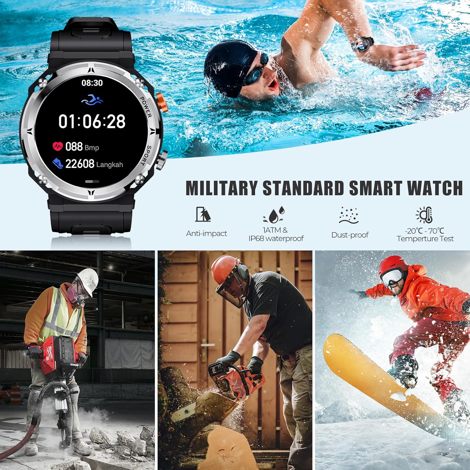Newest armor design military smart watch for men with loads of practical function, a true embodiment of rugged elegance. Has conquered 12 grueling military-grade tests, proving its unwavering durability and reliability in the face of extreme conditions, perfect for outdoor activities!