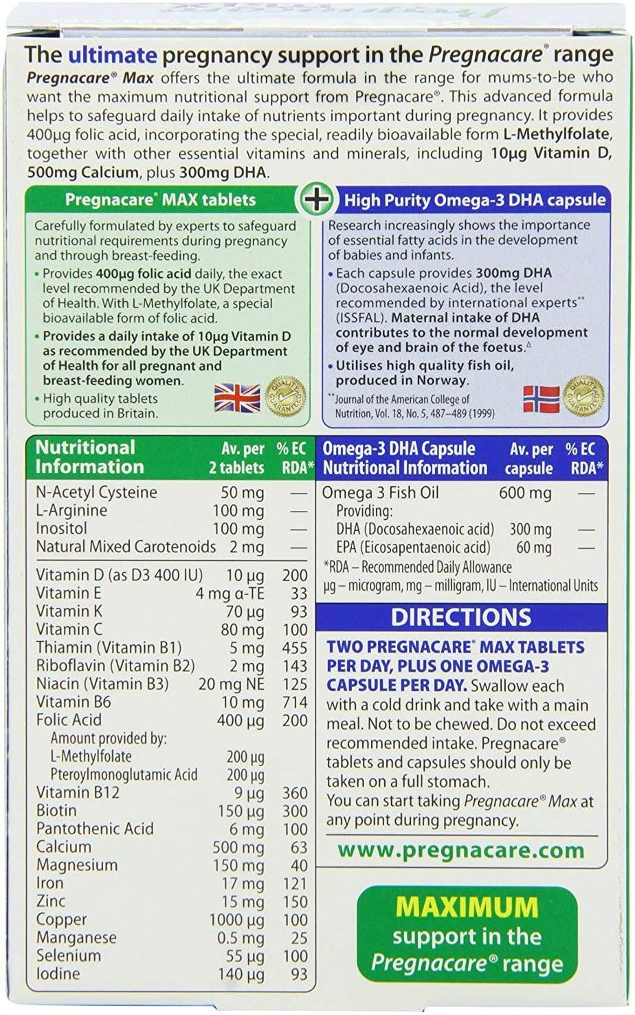 Pregnacare Max Offers The Ultimate Formula In The Range For Mums To Be Who Want The Maximum Nutritional Support From Pregnacare. This Advanced Formula Helps To Safeguard Daily Intake Of Important Nutrients During Pregnancy. The Dual Pack Provides 400G 0.4Mg Folic Acid, Incorporating The Special, Readily Bioavailable Form L Methylfolate, Together With Other Essential Vitamins And Minerals, Including 10G Vitamin D And 500Mg Calcium. The Pack Also Contains A 300Mg Omega 3 Dha Capsule For Normal Foetal Brain & Eye Development. Pregnacare Max Tablets Have Been Carefully Formulated By Experts To Safeguard Nutritional Requirements During All Of Pregnancy. Pregnacare Max Is The ‘Next Generation Formula’ And Provides 400G Folic Acid Daily, The Exact Level Recommended By The Uk Department Of Health. With L Methylfolate, A Specially Efficient Form Of Folic Acid, Making This The Ultimate Formula In The Pregnacare Range.