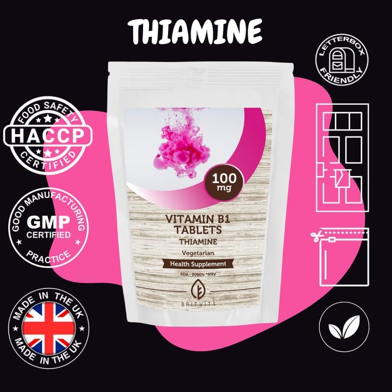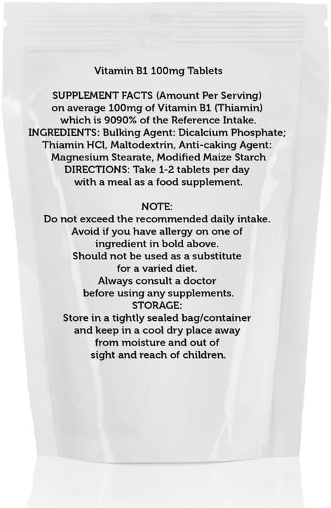 SUPPLEMENT FACTS (Amount Per Serving) on average 100mg of Vitamin B1 (Thiamin) which is 90% of the Reference Intake. INGREDIENTS: Bulking Agent: Dicalcium Phosphate; Thiamin HCl, Maltodextrin, Anti-caking Agent: Magnesium Stearate, Modified Maize Starch DIRECTIONS: Take 1-2 tablets per day with a meal as a good supplement NOTE: Do not exceed the recommended daily intake. Food supplements should not be used as a substitute for a varied diet and healthy lifestyle. Avoid if you have allergy on one of ingredient above.