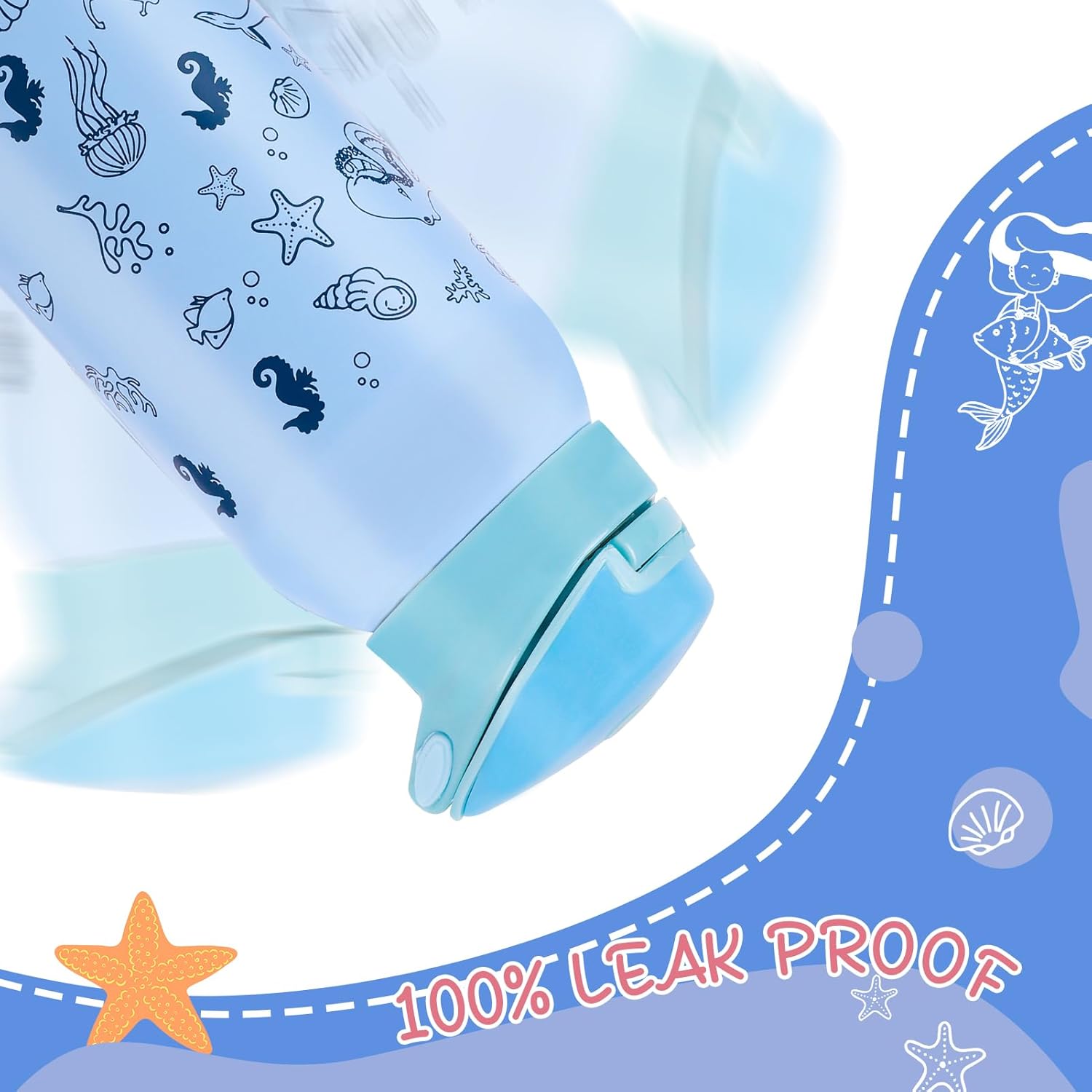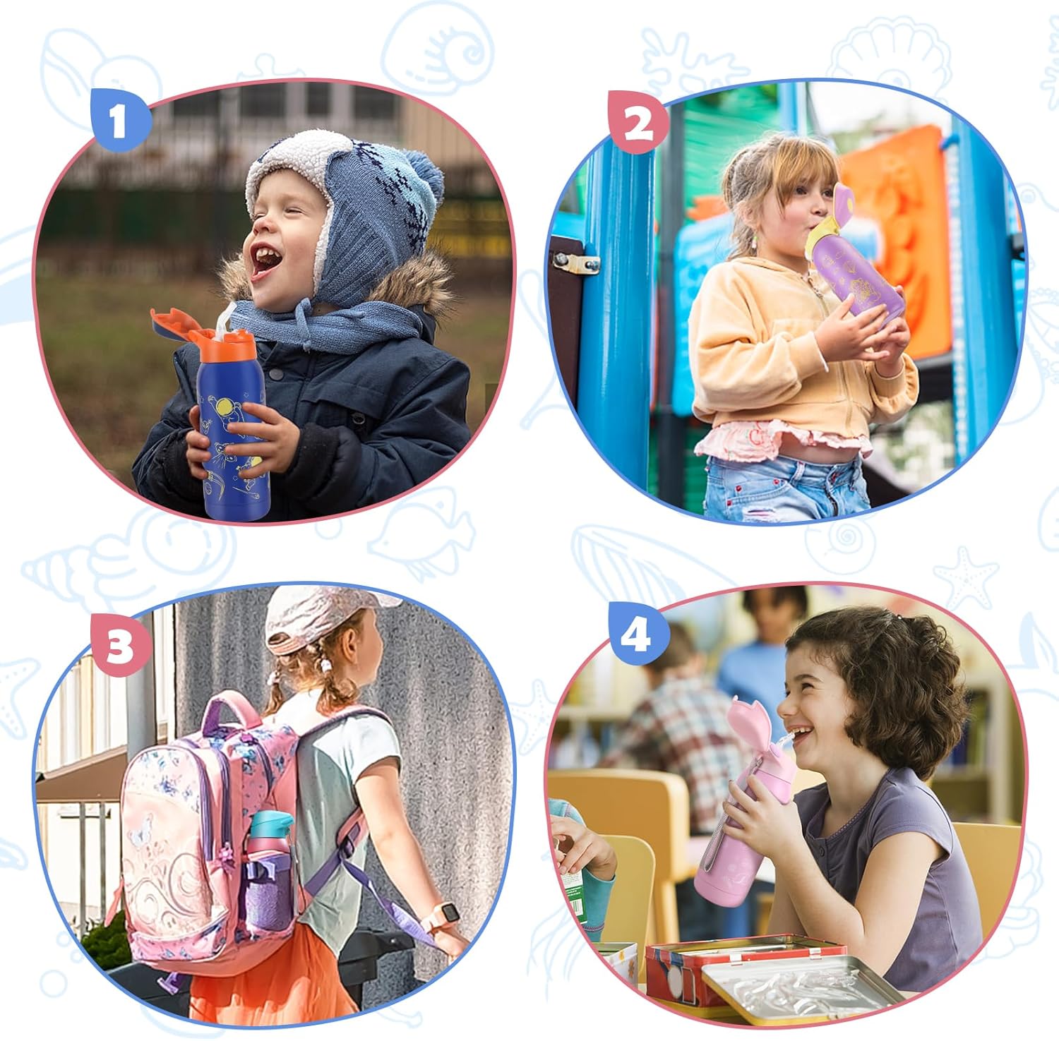 The kids water bottle features double-wall 304 stainless steel vacuum insulation technology that keeps warm for 9 hours and cold for 12 hours, ensuring that your child is always hydrated, ideal for school, outdoor activities or home.
