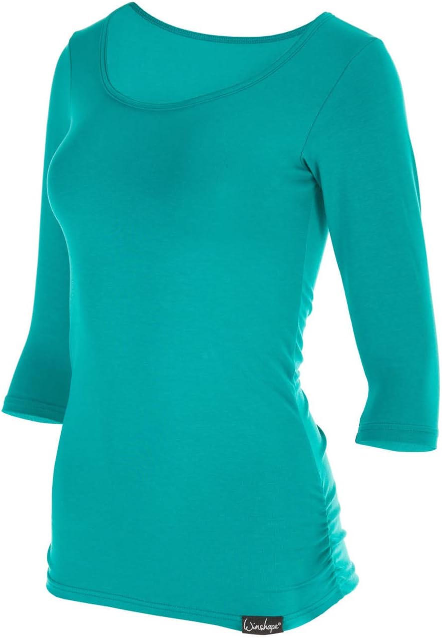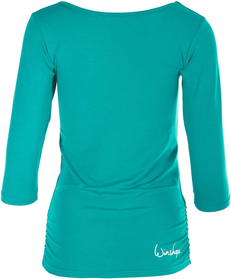 3/4 sleeve shirt WS4, Winshape Flow stylefeel good, feel Winshape. The 3/4 sleeve shirt WS4 from the Winshape Flow Style collection impresses with the finest fabric without losing a touch of function. The close-fitting and slightly tailored crew neck shirt is a must for all women who like to wear 3/4 sleeves. A subtle detail is the side ruffles at the waist which accentuate the waist and give this shirt a fashionable accent. The comfortable cotton-elastane blend feels incredibly soft and makes the shirt your favourite companion even beyond the yoga and pilates classes.