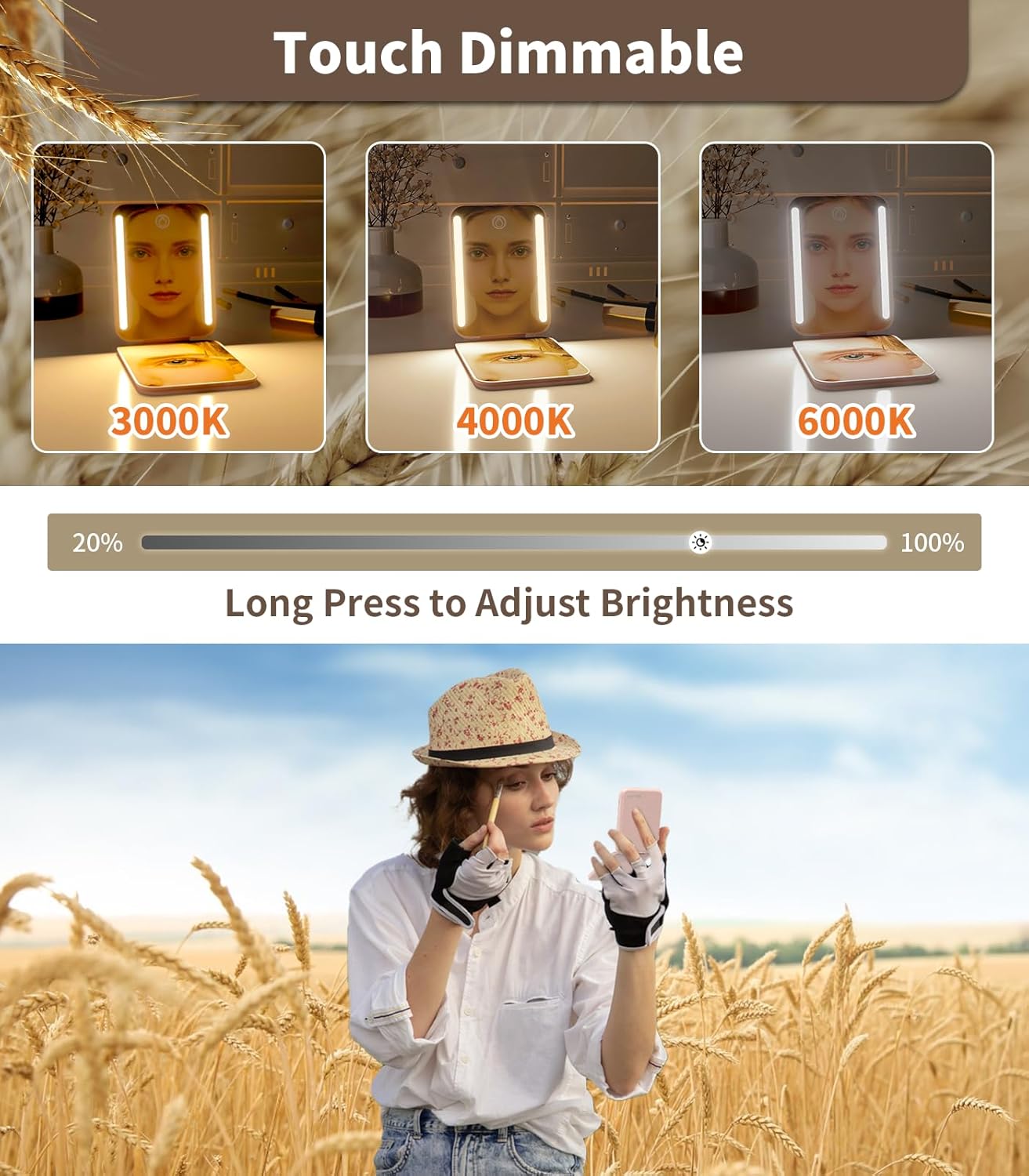 💫TOUCH DIMMING & MEMORY FUNCTION DESIGN – This upgraded rechargeable compact mirror has 3 colour temperatures (3000K/4000K/6000K) to choose from, you can adjust the light colour by simply clicking the touch button. and also has a memory function, when you turn off the light by directly closing the mirror, the next time you use it the brightness and colour temperature will be the same as the last time you used it.