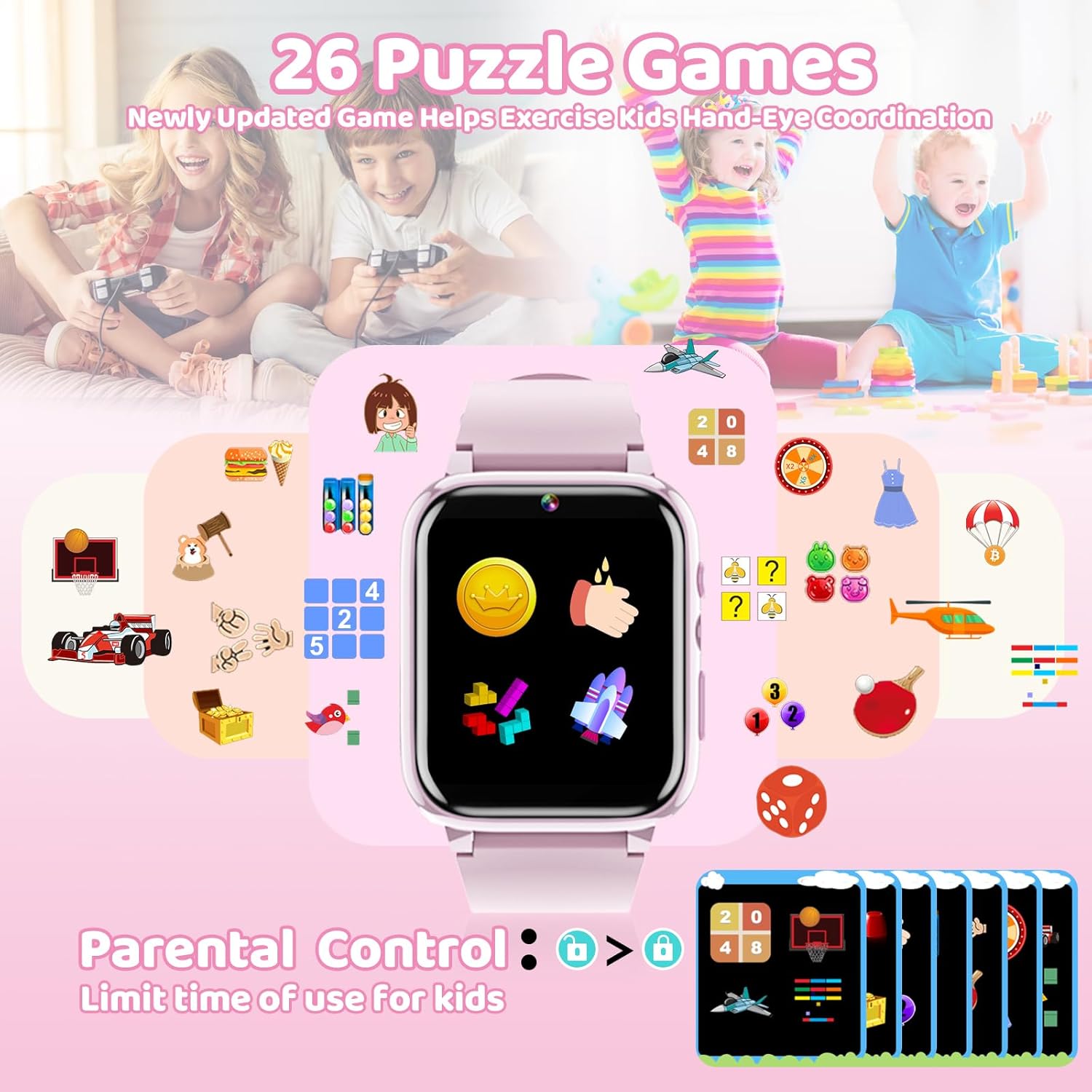 🎁[26 Puzzle Games] The kids smart watch has 26 wonderful games, the rich choices can make your child have a happy childhood time during long car rides or waiting, and it helps kids learn through entertainment. The kids smart watch has parental control function, parents can set the game entertainment time to prevent addiction, so as to protect children’s physical and mental health.