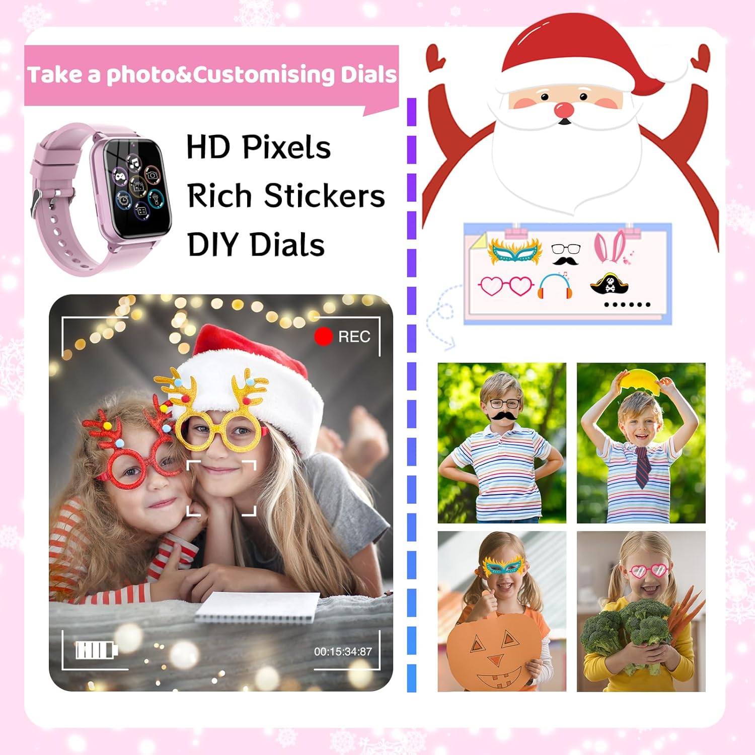 🎁[Ideal Gift for Kids] Smart watches for kids has a built-in HD camera and cute special effects magic stickers, kids can use it to take fun selfies with their family and friends and customise the photos as wallpapers to record great moments. The watch battery is upgraded to 500 mAh, the battery life is about 7-10 days. If you have any questions, please contact us!
