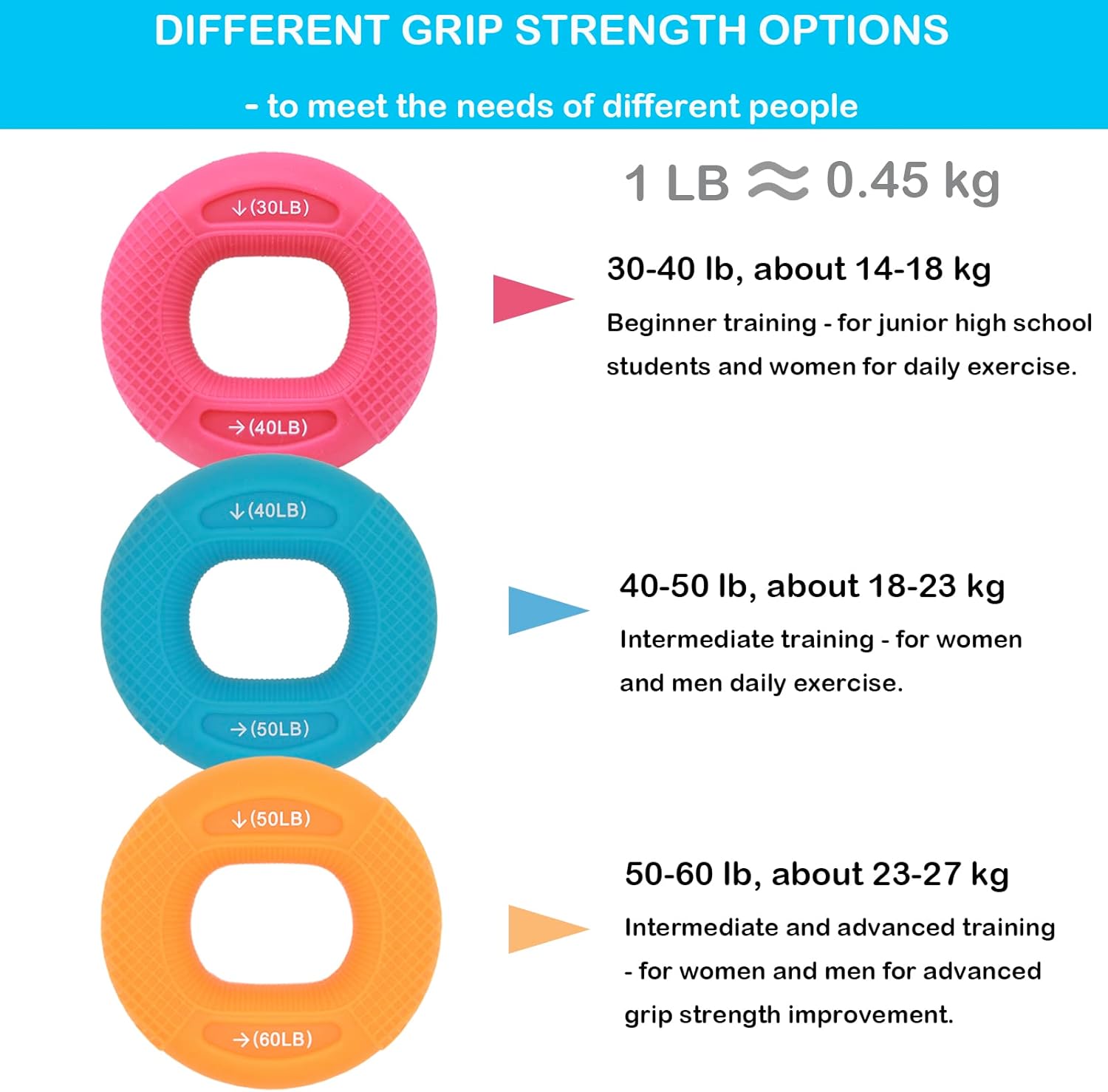 Upgraded hand strengthener for more resistance, the different colors have an obviously different tension and strength.Light Resistance (30-40lbs) – For beginners or hand physical therapy.Medium Resistance (40-50lbs) – For daily intensive training for men or women.Hard Resistance (50-60lbs) – For intermediate and advanced strength training and muscle toning.